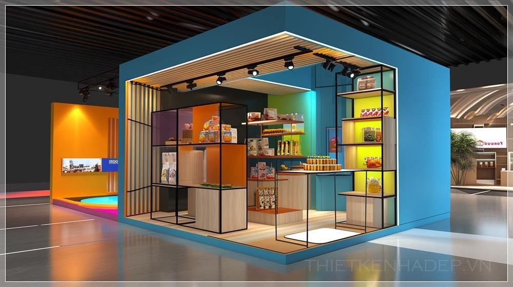 Exhibition booth design renderings, booth, The color scheme is simple, snack booth design, bright colors, light, elegant, colorful, Display shelves are needed to place paper bags, plastic cutlery, and cardboard exhibition items. --ar 16:9 --v 6.0 --s 60
