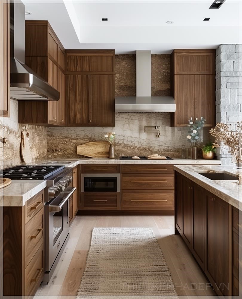 PROMPT: a kitchen that has walnut cabinets and marble countertops, in the style of cottagecore, brown and bronze --ar 13:16 --v 6.0 --s 250 Ý Nghĩa: