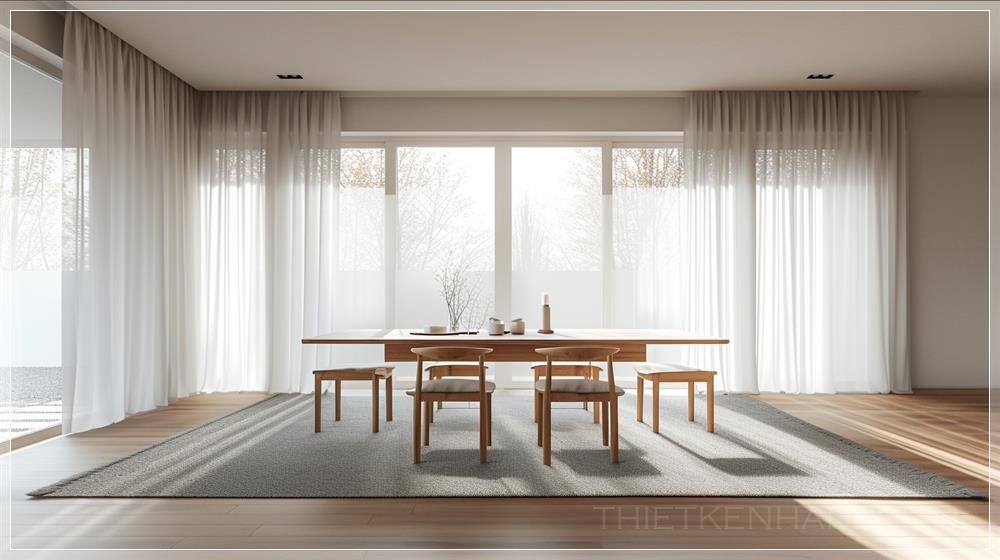 an AI image of an open, minimalist dining room with white walls, a wooden floor, and large windows covered with drapes. The room should have a wooden table and chairs placed on a gray carpet, creating a serene and inviting atmosphere --ar 16:9 --v 6.0