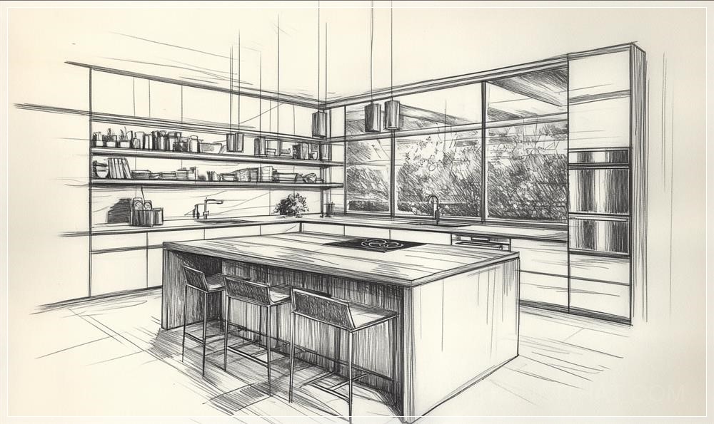 Một bản phác thảo bằng bút mực của thiết kế bếp hiện đại. Thiết kế nên có những đường nét mượt mà, sạch sẽ với các thiết bị cao cấp được tích hợp vào tủ bếp. Bao gồm một đảo bếp với chỗ ngồi và đèn thả treo phía trên. Bản phác thảo cần thể hiện các tùy chọn lưu trữ rộng rãi, bao gồm tủ trên và kệ mở. Sử dụng các yếu tố như tấm ốp backsplash với các họa tiết hình học tinh tế và kết hợp ánh sáng tự nhiên từ những cửa sổ lớn. Nhấn mạnh một bố trí rộng rãi và chức năng, kết hợp giữa thẩm mỹ đương đại và tính thực tiễn.