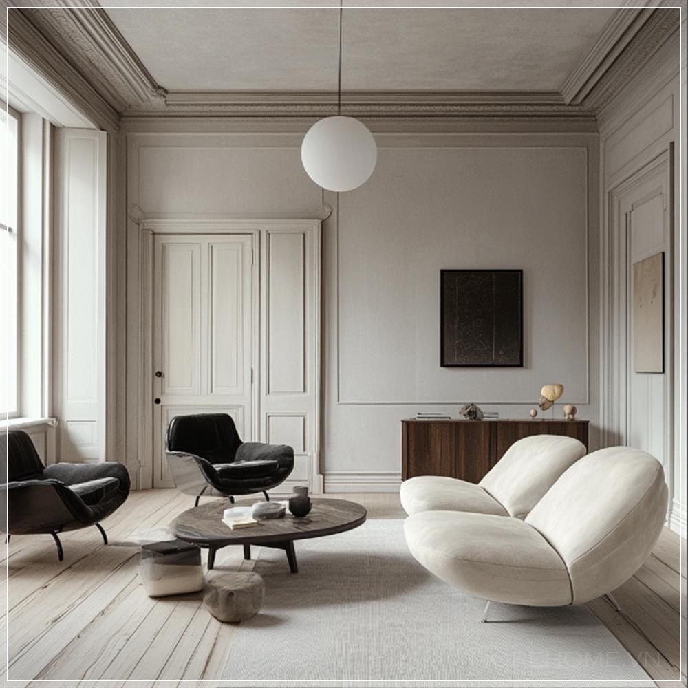 Phòng khách sang trọng theo phong cách thiết kế Đan Mạch với sự kết hợp giữa sự tinh tế và hiện đại, tạo ra một không gian ấm cúng và trang nhã. Màu trắng của các bức tường làm nổi bật các món đồ nội thất và ánh sáng tự nhiên, mang lại cảm giác thư giãn và thanh thoát.