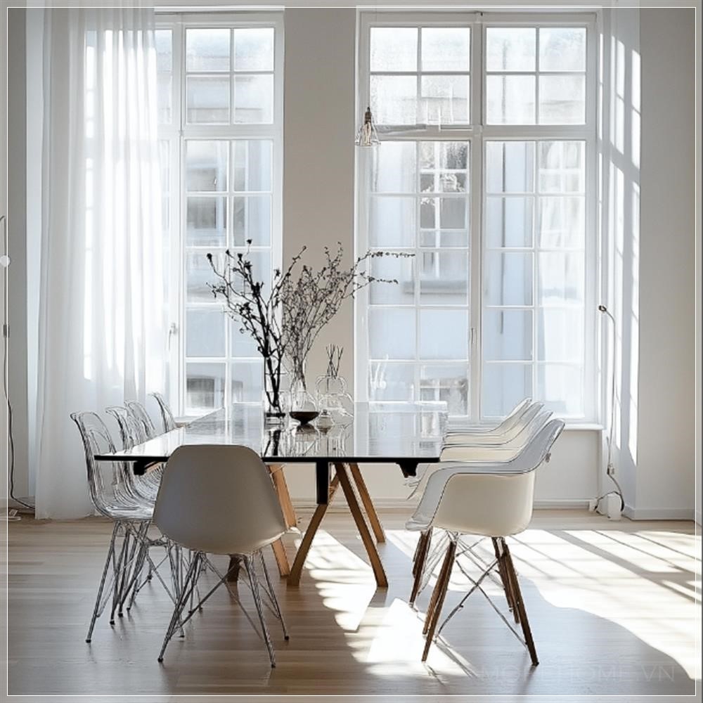 Thiết kế nội thất tối giản, không gian thoáng đãng và gọn gàng. Nội thất thấp hoặc trong suốt, như bàn kính hay ghế trong suốt, được sắp xếp sao cho không che khuất các khu vực quanh cửa sổ. Tường sáng màu và không gian không bị lộn xộn, tối đa hóa ánh sáng tự nhiên. Ánh nắng chiếu qua cửa sổ, chiếu sáng không gian. Một vài chi tiết cây xanh nhẹ nhàng để thêm sức sống mà không che khuất các ô cửa. Yêu cầu: hướng ngang, độ phân giải cao để chi tiết rõ nét, ánh sáng mềm mại và tự nhiên.