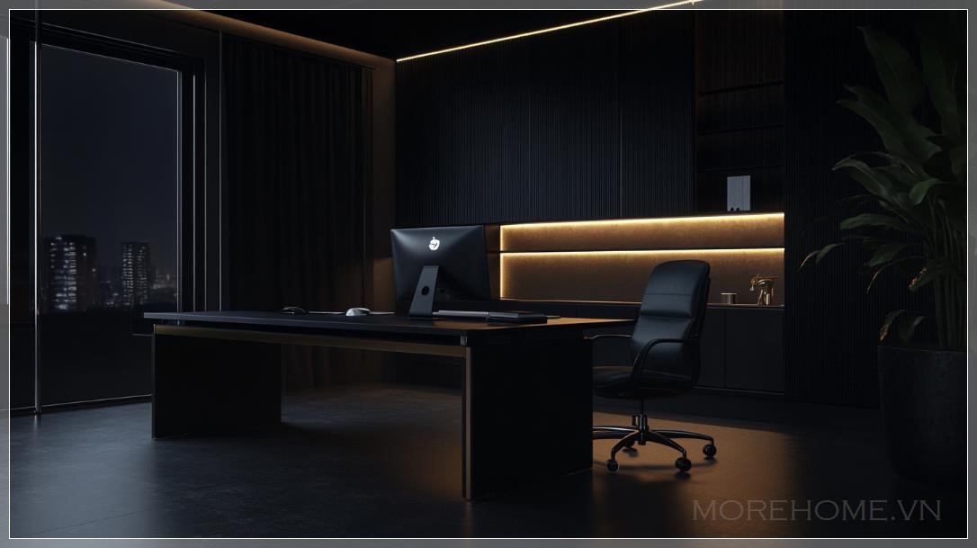 Phòng làm việc dành cho giám đốc được thiết kế theo phong cách tối giản, tạo cảm giác hiện đại và tinh tế. Không gian mang sắc thái tối, chủ đạo là màu đen kết hợp điểm nhấn ánh vàng, toát lên vẻ sang trọng, mạnh mẽ. Hiệu ứng ánh sáng ban đêm cùng phong cách siêu thực tạo nên trải nghiệm thị giác ấn tượng và đẳng cấp.