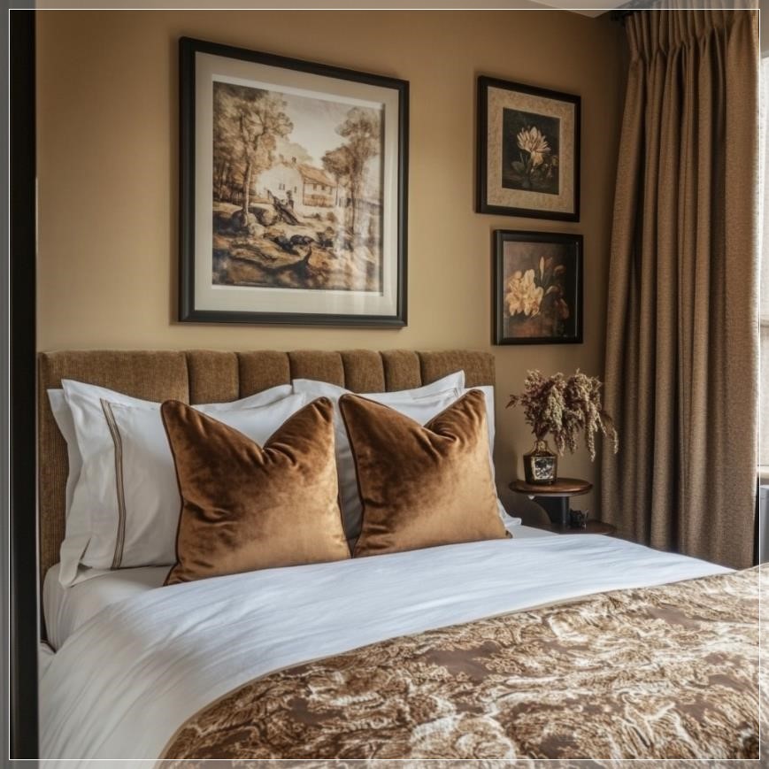 Một căn phòng ngủ nhỏ mang phong cách hiện đại, được thiết kế tối giản nhưng tinh tế. Điểm nhấn nổi bật trong không gian là một bức tranh nghệ thuật treo trên tường, góp phần tạo nên cảm giác ấm cúng và thẩm mỹ cho toàn bộ căn phòng.
