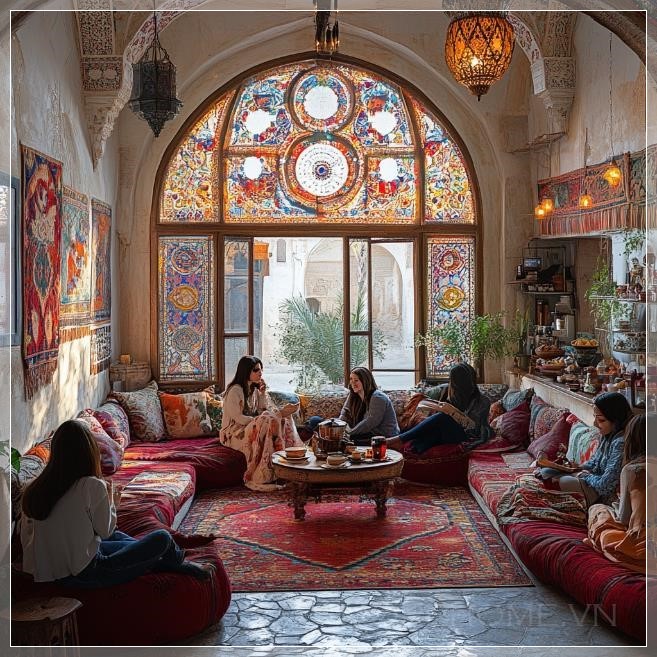 Giúp tôi tạo ra một bức ảnh về không gian này, phòng được trang trí với đặc trưng mạnh mẽ của Trung Đông, tường được sơn với những hoa văn đẹp mắt, treo những tấm thảm đầy màu sắc. Cửa sổ và cửa vòm góp phần tạo nên phong cách kiến trúc độc đáo. Ở giữa có một cốc cà phê đẹp, xung quanh là những chiếc sofa không chân, bọc vải họa tiết thảm đỏ, mềm mại và thoải mái. Các sofa thường được sắp xếp thành hình vuông để mọi người ngồi quanh và trò chuyện. Sàn được phủ thảm đỏ, hoa văn trên thảm tinh xảo, hài hòa với hoa văn của sofa, có một quầy bar giữa các vị trí. Góc phòng có vài chậu cây xanh, mang lại sự sống cho không gian. Có thể có bộ ấm trà tinh xảo trên bàn. Bức ảnh được chụp từ trên cao. Chất lượng ảnh 4K.