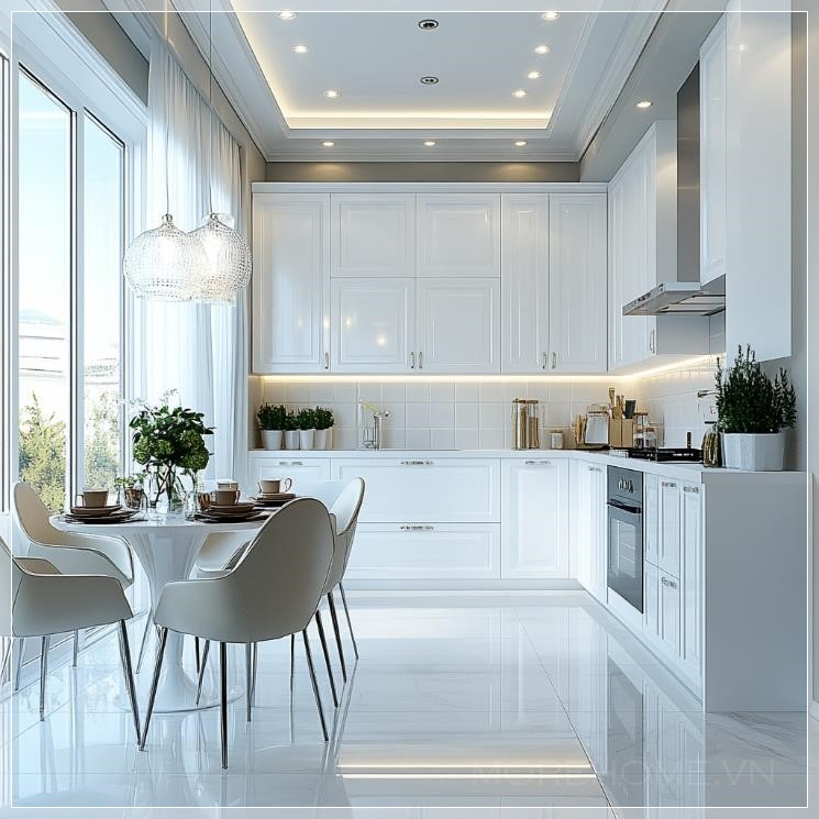 Nội thất của căn bếp màu trắng, thiết kế hiện đại và tối giản, với các bề mặt sáng bóng, tạo cảm giác không gian rộng rãi và sạch sẽ. Tủ bếp và kệ được sắp xếp gọn gàng, tạo nên một không gian bếp tiện nghi và sang trọng.