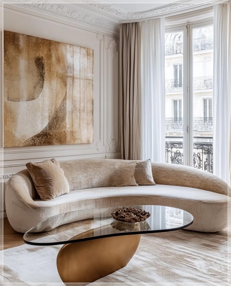 A living room with an elegant, curved sofa, a glass coffee table, and a large abstract artwork on the wall. The space is filled with soft, pastel colors of beige walls, white curtains, and golden accents for a luxurious decor. A warm color palette creates a cozy ambiance in this chic Parisian apartment interior design. --ar 13:16