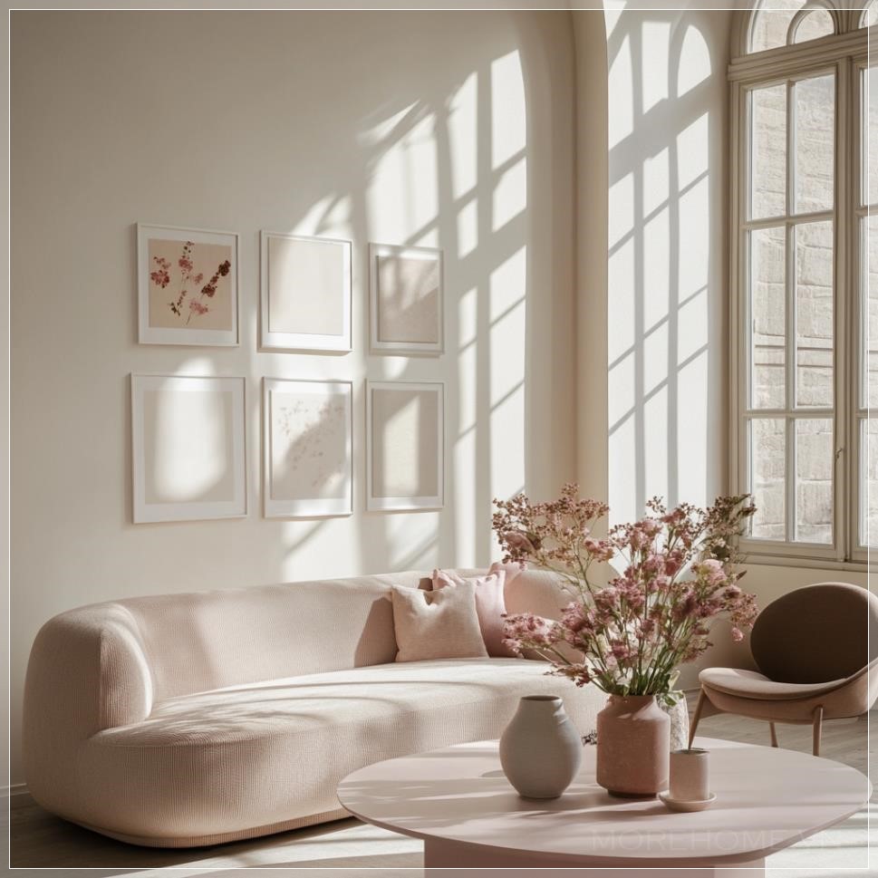 Phòng khách sáng sủa và thoáng đãng với sáu poster nhỏ màu trắng A4 không có khung trên tường. Một chiếc sofa màu hồng nhạt đặt dưới các poster, cùng với bàn cà phê hồng thanh lịch có các lọ hoa. Một chiếc ghế nhỏ màu nâu được đặt ở góc phòng. Ánh sáng mặt trời chiếu qua các cửa sổ lớn, tạo bóng mềm mại khắp không gian.