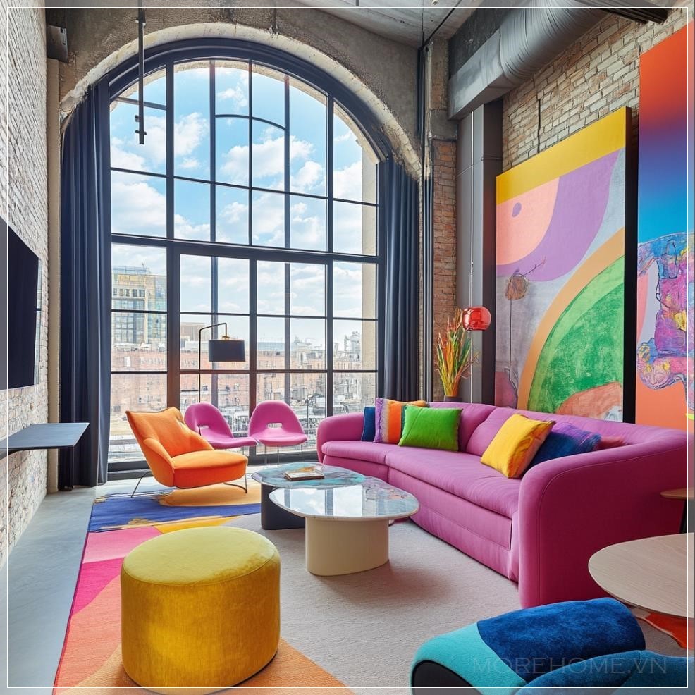 Ảnh chất lượng cao, cửa hàng hiện đại trong không gian loft màu sắc tươi sáng, xu hướng nội thất 2023, cửa sổ lớn, màu sắc nổi bật.