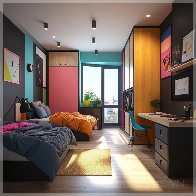 Phòng ký túc xá với thiết kế sống động, bao gồm tủ quần áo, giường và bàn học, mang phong cách giống như một phòng khách sạn hiện đại, tươi sáng và ấm cúng.