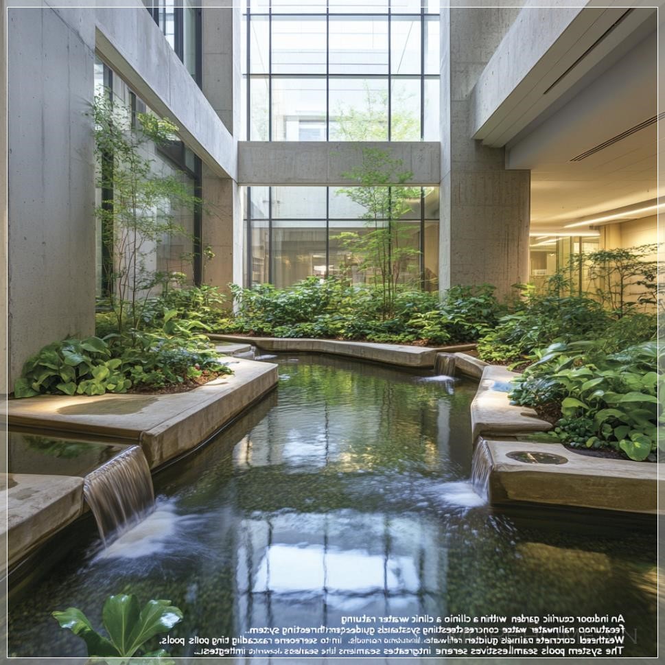 Vườn sân trong này nằm trong một phòng khám, sử dụng hệ thống thu nước mưa bền vững để tối ưu hóa việc sử dụng tài nguyên tự nhiên. Các kênh nước bằng thép gỉ và bê tông dẫn dòng nước mưa đã thu được qua các máng nước xếp tầng, chảy vào các hồ phản chiếu yên tĩnh. Hệ thống này hòa quyện hoàn hảo với không gian xanh tươi, tạo ra một môi trường thư giãn và giúp thanh lọc không khí tự nhiên, đồng thời nâng cao không gian chữa lành.