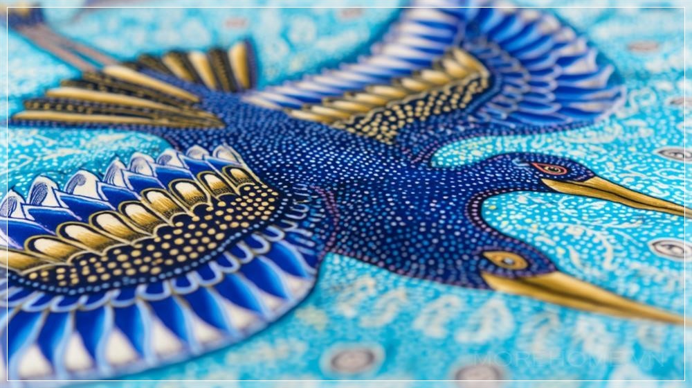 Một bức ảnh cận cảnh của vải batik thể hiện họa tiết của một con vạc được vẽ bằng batik với các gam màu xanh dương và vàng. Con vạc đang chuẩn bị bay ra khỏi vải batik, một nửa cơ thể của nó vẫn còn trong vải, và nửa cơ thể còn lại đã bay ra ngoài thực tế, tạo nên một hình ảnh rất tưởng tượng. Nó được đặt trên nền mềm mại để làm nổi bật bảng màu phong phú và quá trình batik chi tiết. Tác phẩm này biểu trưng cho sự đơn giản, di sản và sự phong phú văn hóa. Cảnh quay của bộ phim.