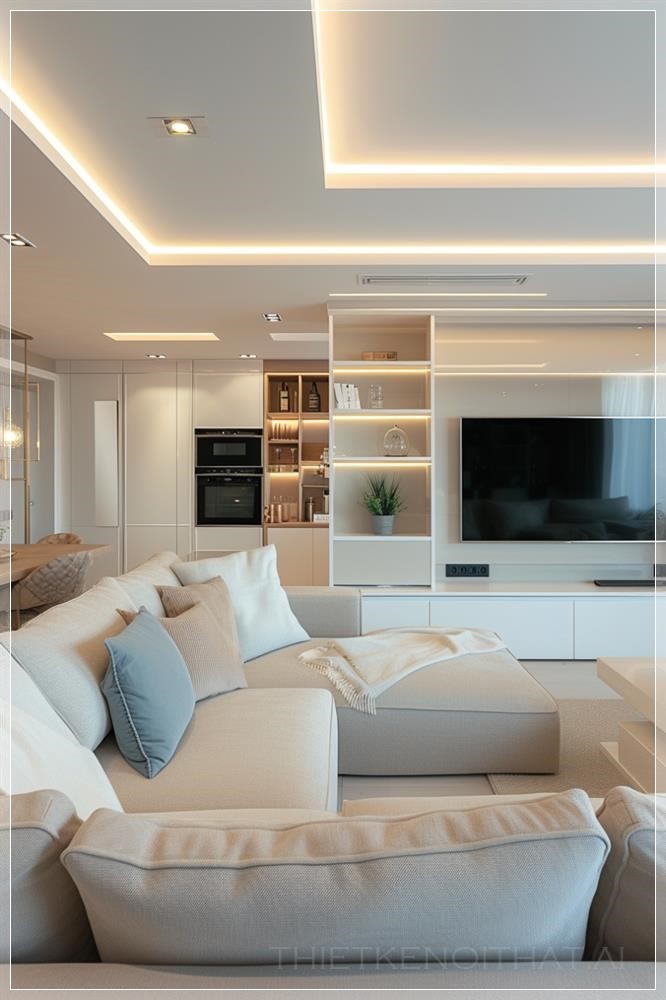 Panoramic view of the huge apartment interior with low ceilings. The focus is on the living room combined with the kitchen. Not a big sofa and armchairs. TV. Bookcase above the TV. Style: minimalism Colors: white, snow white, ivory. White combined with other colors. Lighting: natural daylight Medium: Photography. XComposition: Shot with a Sony A7R IV, using a Sony FE 16-35mm f/2.8 GM lens, Resolution 61.0 megapixels, ISO sensitivity: 200, Shutter speed 1/80 second --ar 2:3 --v 6.0