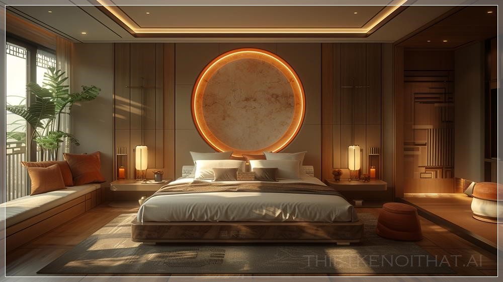 luxury master bedroom design on the site, in the style of nature-inspired compositions, light brown and light bronze, tang yau hoong, suspended/hanging, subtle surface decoration, linear simplicity, meticulously detailed --ar 16:9 --s 500 --v 6.0