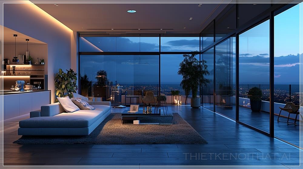 PROMPT: Modern open living room at night, with beautiful ambient occlusion and furniture --ar 16:9 --v 6.0 --style raw Ý Nghĩa: