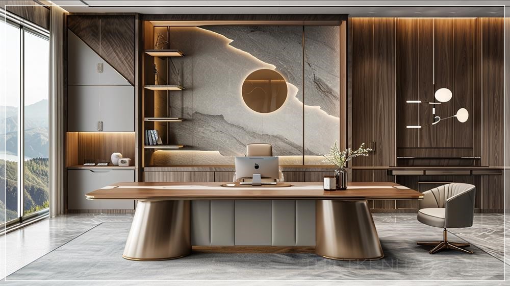 A 3.6m president table, modern style high-end double cabinet khaki color metallic paint, desktop wood grain front bezel corrugated plate modeling scene background no modeling khaki color high detail 3d rendering --ar 16:9 --v 6.0 --style raw