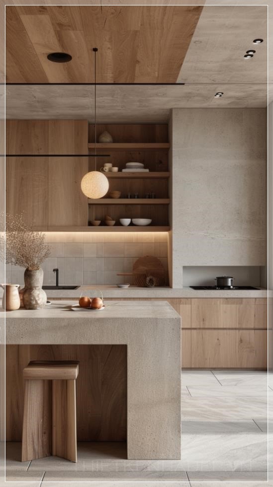 PROMPT: hyper realistc photo, minimalistic, interior desgin, kitchen, pale wood cabinets, concrete counter top, white tile backsplach --s 350 --ar 9:16 --v 6.0 Ý Nghĩa: