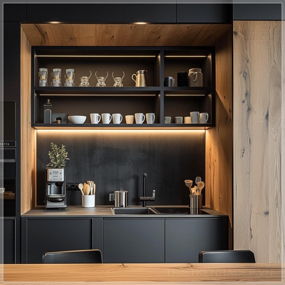 PROMPT: An interior where cups and utensils can be emphasized in a black and wood-toned interior. --v 6.0 Ý Nghĩa: